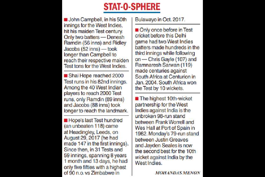 Both overnight batters John Campbell and Shai Hope brought up their centuries, though their partnership didn’t last too long after play resumed on Monday. Thanks to their last-wicket pair of Justin Greaves and Jayden Seales — the duo put on a stubborn 79-run stand — the Windies stretched their second-innings total to 390 and set India a target of 121.