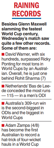 Glenn Maxwell raced to the fastest World Cup century and David Warner hit his second successive hundred as Australia picked up a hat-trick of wins to compensate for their successive losses at the start of the tournament.