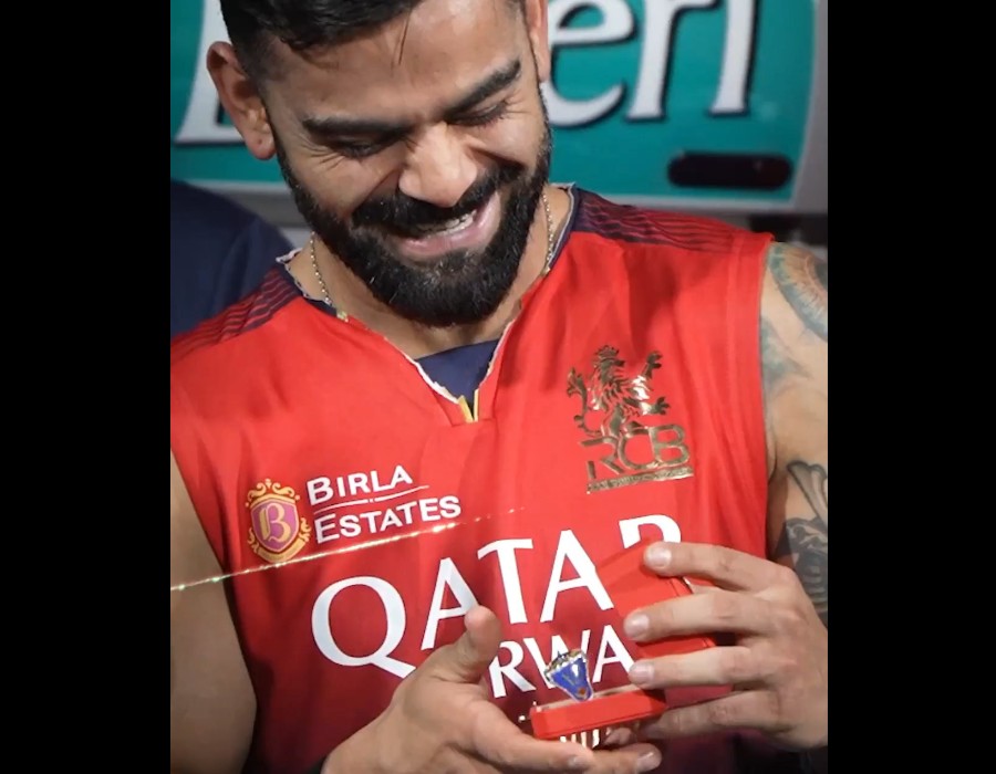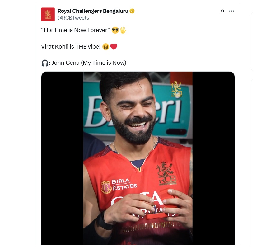 In a video posted by RCB’s official X handle, the 35-year-old was seen flashing his custom-made, diamond-studded championship ring as Cena’s iconic entrance theme “My Time is Now” played in the background.