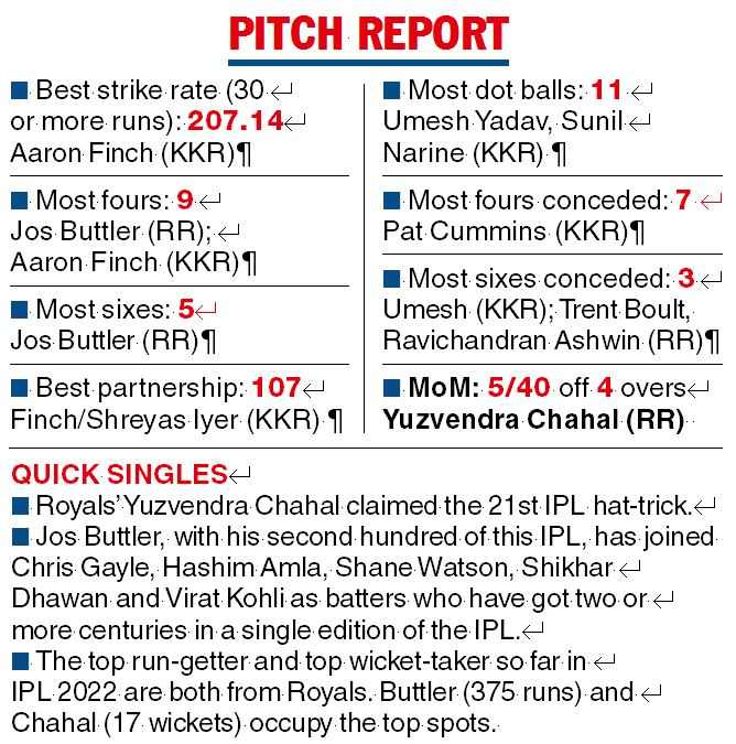 Buttler’s imperious 61-ball 103 first powered the Royals to a massive total of 217 for 5 after they were put in to bat by Kolkata Knight Riders (KKR). Thereafter, Chahal (5/40) weaved his magic with the ball just when it was needed, taking as many as four wickets in the game-turning 17th over, including a hat-trick, to help the Royals to a seven-run win over the Knights.