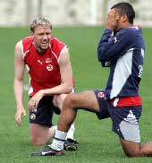 | Stephane Henchoz (left) and Johan Vonlanthen of Switzerland at practice in Praia del Rey on Friday |