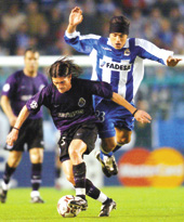 | Deportivo la Coruna’s Aldo Duscher (right) challenges Porto’s Pedro Mendes during their Champions League semi-final second leg match at the Riazor Stadium on Tuesday. (Reuters) |