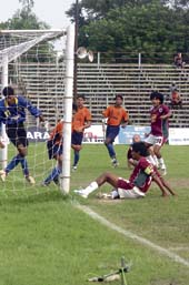 In fact, before everyone had settled down, came the first goal. It was an early indication of what was to follow when Dharamjit Singh floated in a centre from the far right. Eduardo Coelho headed it down for Dipendu to sound the net in the eighth minute. More attacks followed.