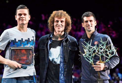 | PSG defender David Luiz (centre) with Novak Djokovic and Milos Raonic, in Paris, on Sunday. (AFP) |