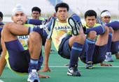 | Indian hockey captain Dilip Tirkey (centre) with teammates Sandeep Singh (left) and Hari Prasad during a practice session at the Karachi hockey stadium on Wednesday. (AFP) |