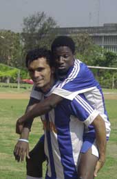 | Beto and Ranty Martins share a light moment during Dempo’s practice session on Saturday, while (picture down) East Bengal coach Philippe de Ridder watches Alvito D’Cunha go for a shot. Pictures by Gautam Bose and Santosh Ghosh |