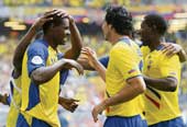 | Ecuador’s Agustin Delgado (left) celebrates with teammates after scoring against Costa Rica in Hamburg on Thursday. (Reuters) |
