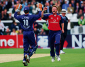 | Geraint Jones and Paul Collingwood (right) celebrate the dismissal of Andrew Symonds on Thursday. (AFP) |