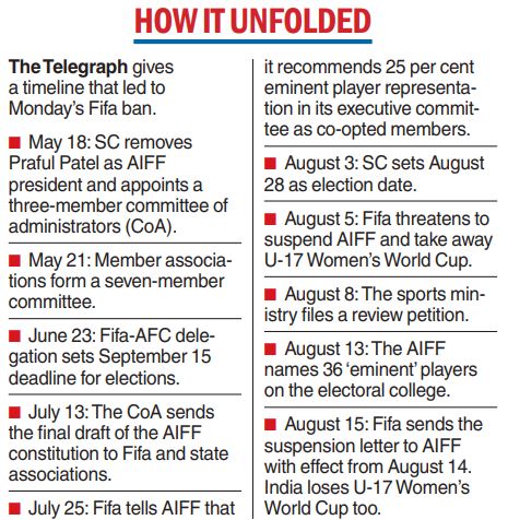 The suspension, according to many watchers of Indian football, was “inevitable” after the Fifa/AFC (Asian Football Confederation) sent a joint letter on August 5 citing serious deviations from the agreed roadmap. Fifa-AFC had raised questions about the August 3 Supreme Court verdict which laid down the modalities for the elections to the AIFF general body. One of the issues is the appointment of 36 former players to the electoral college, a decision Fifa said violated its constitution.
