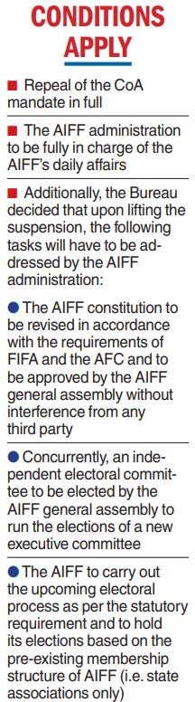 Fifa said the ban will be lifted only after the “repeal of the CoA mandate in full” and once the federation administration is “fully in charge” of its daily affairs.