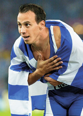 | Jaouad Gharib of Morocco celebrates after winning the marathon in Helsinki on Saturday. (AFP) |