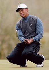 | Tiger Woods reacts after missing a putt during the third round of the WGC-Accenture Match Play Championship in Marana, Arizona, on Friday. (Reuters) |