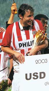 | PSV captain Mark van Bommel with the Peace Cup in Seoul on Tuesday. (Reuters) |