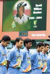 | Indian players at the Gabba, observe a minute’s silence before the match on Tuesday as a mark of respect to David Hookes who was killed on Monday. (Reuters) |