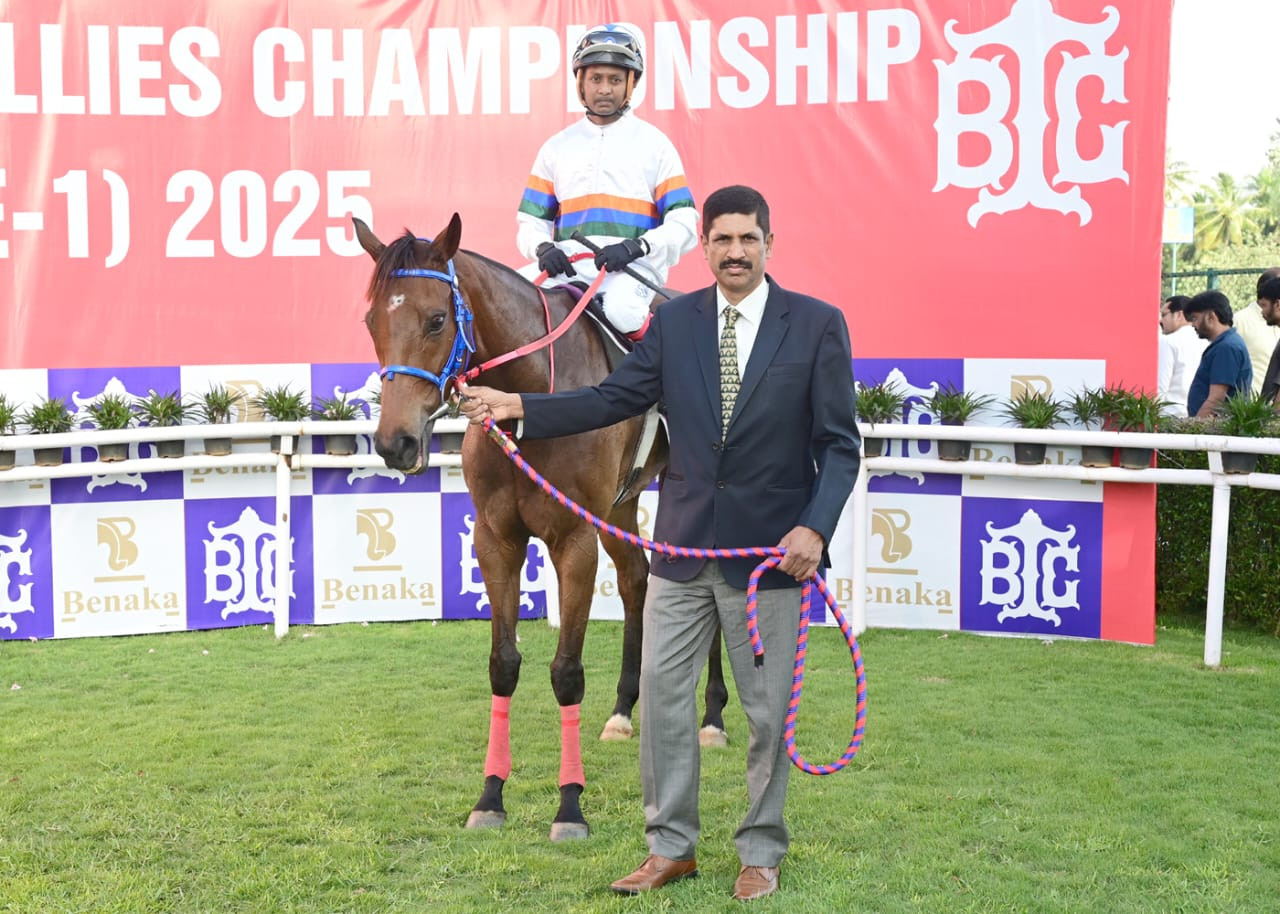 CORINTHIAN (Trevor Patel), STELLANTIS (R N Darshan), MYSTICAL AIR (Akshay Kumar), KRYSTALLOS (Shreyas Singh) and GLAZE (M Rajesh Kumar) in 1-29s; from 1,200m to 600m 50s. All jumped out well. They were separated by 2 ls, a length, 3 ls and 6 lengths.