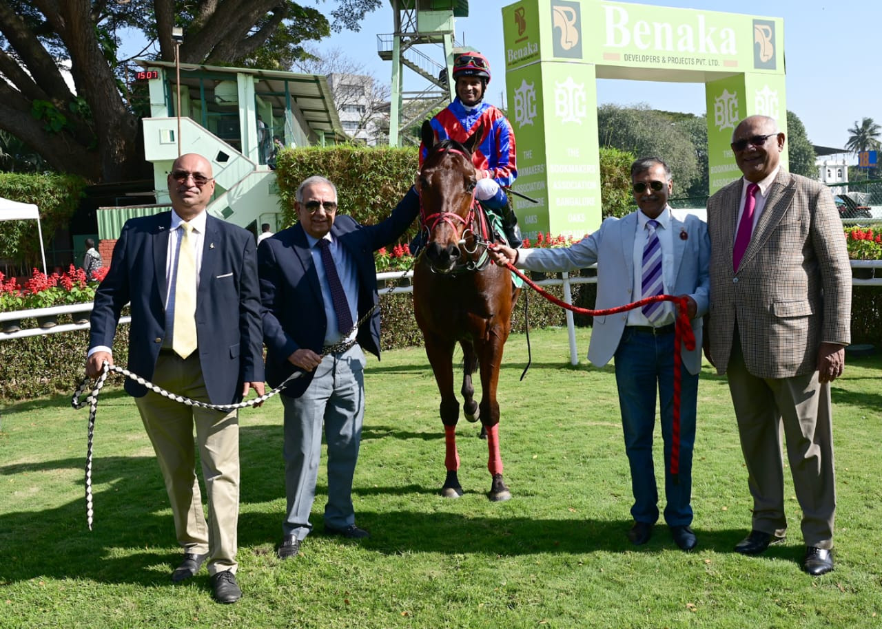 NEVER GIVE IN (Saddam Hussain), ARALINA (Antony Raj), DENSETSU (Soufyane J Moulin), VAL D’ARAN (P Vikram) and SLAINTE (Ritesh Gochhi) in 1-17s; from 1,200m to 600m 38s. All jumped out well. They were almost level.