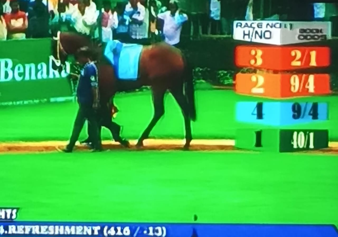 REFRESHMENT (Trevor Patel) and SASSY SARAH (Chethan Kalay) in 1-24s; (1,000m) 1-8s; (600m) 39s. The former was 5 ls better.