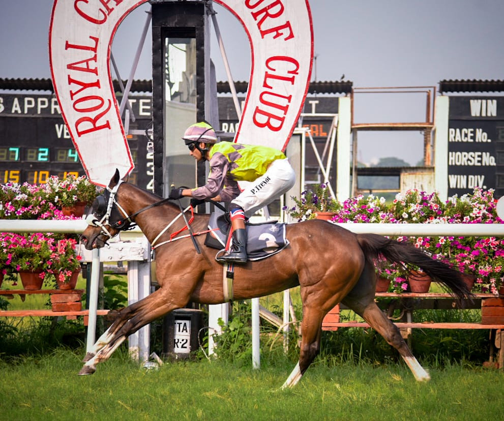 MADRAS CHEQUE (Sonu Mishra) and CUPID'S WAY (Ankush) in from 2,200m to 1,400m 12, 24, 39, 54s. Both jumped out well. Former trounced later.