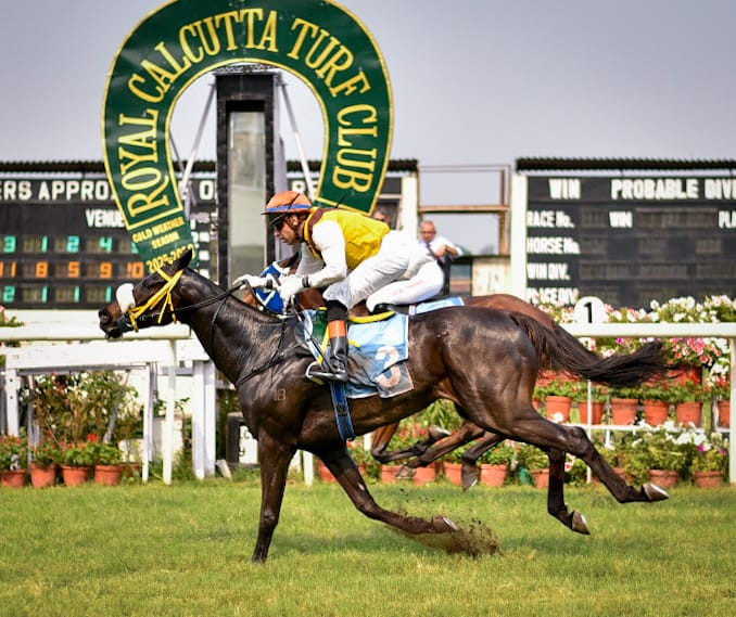 3YRO HAPPY MORNING (R Manish) and ROYAL KING (Tauseef Ahmed) in from 2,200m to 1,600m 43.8s. They jumped out well. The former was a length better.