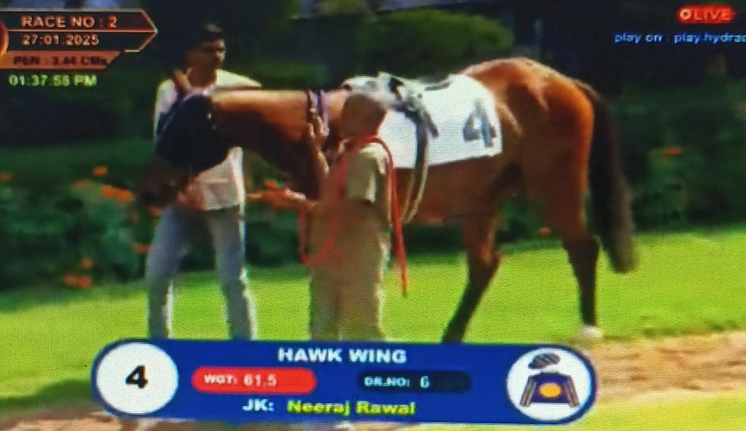 Winter Inner Race GrassHyderabad, 14 Jan 2025HAWK WING (G Naresh) in 1-6s; (800m) 52s; (600m) 40s. Moved Well.