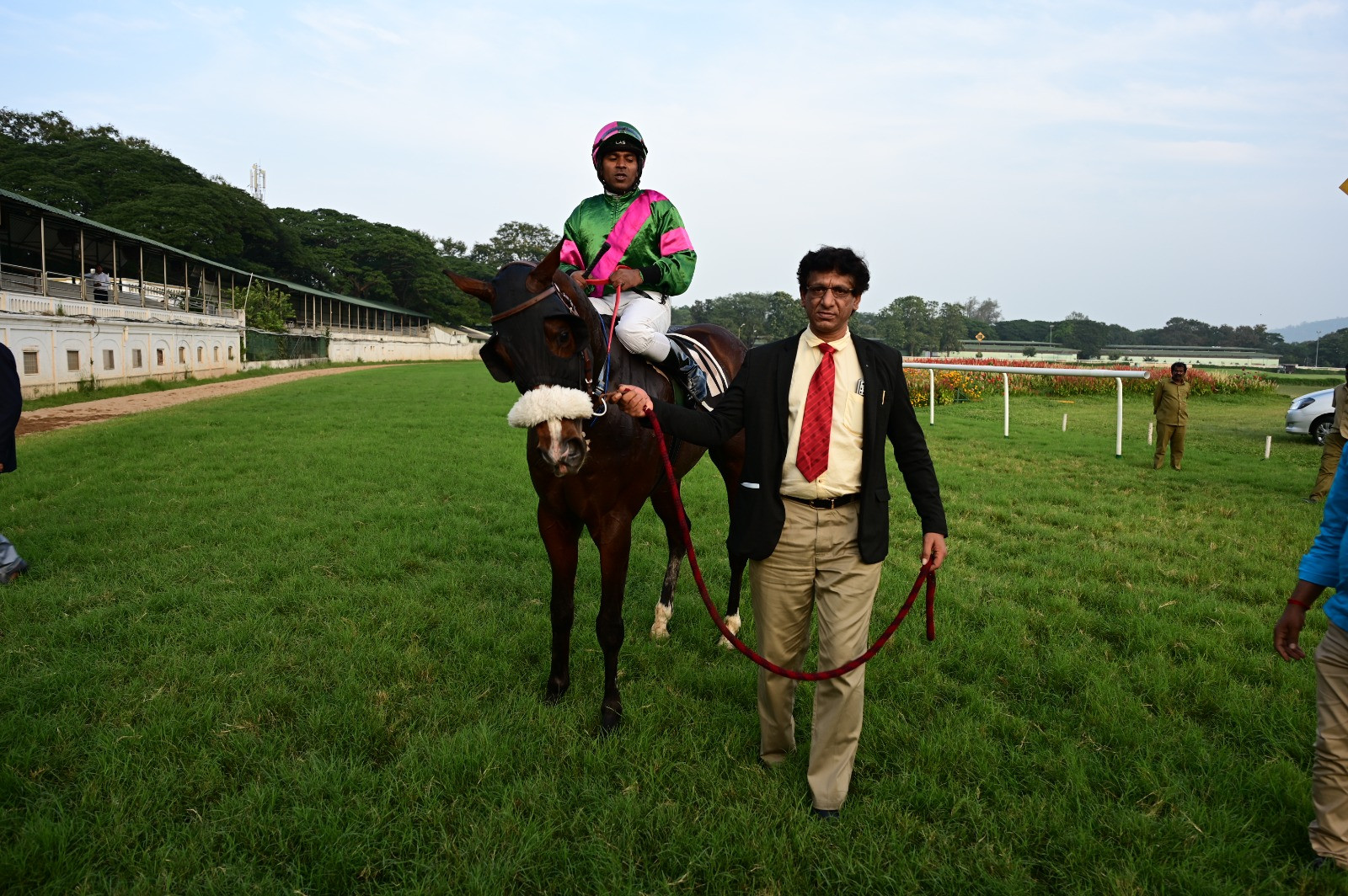 SEA THE SUN (R Shiva Kumar), D GOLD STAR (C Bramesh), THE FLYING FEET (Ajeet Kumar) and MARZGOVEL (GautamRajUrs) in 1-12s; (600m) 37s. All jumped out well. They were separated by a length, 3/4 length and 3.4 length.