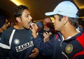 | Rahul Dravid and Anil Kumble at a celebration at the team hotel in Chandigarh on Saturday. (Reuters) |
