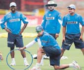 | LORD OF THE RINGS: Team India members (from left) Venugopal Rao, captain Rahul Dravid, Virender Sehwag and Suresh Raina in Port-of-Spain on Thursday, the eve of the fourth ODI against the West Indies. (Reuters) |