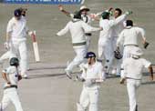 | Danish Kaneria celebrates with teammates the dismissal of Matthew Hoggard on Saturday. (AFP) |