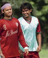 | Noel Wilson (left) and Dipendu Biswas during Mohun Bagan’s practice on Monday |