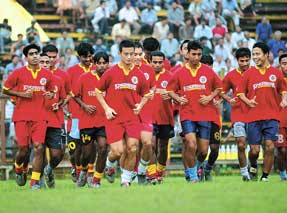 | East Bengal players limber up at the club ground on Wednesday. Picture by Amit Datta |