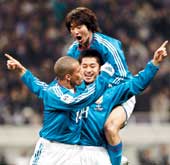 | Japan?s Mitsuo Ogasawara (centre) celebrates his goal against North Korea with teammates Keiji Tamada (back) and Alessandro Santos during their World Cup qualifier in Saitama on Wednesday. (AFP) |