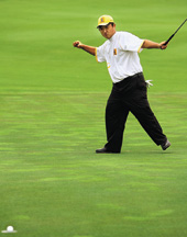 | Mo Joong-kyung of South Korea is ecstatic as he makes a birdie putt on the 17th on Day I of the Dynasty Cup at Mission Hills Golf Club in Shenzhen on Friday. (AFP) |