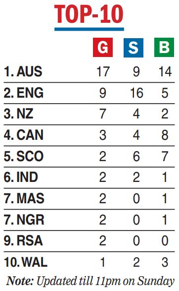 Nigeria’s Edidiong Umoafia took bronze with an effort of 290kg (130kg+160kg).This was India’s fifth medal and second gold from the weightlifting arena at the National Exhibition Centre.