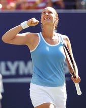 | Mary Pierce of France celebrates after upsetting Maria Sharapova of Russia during their third round match at the US Open in New York on Saturday. Pierce won 4-6, 6-2, 6-3. (Reuters) |