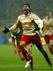 | Rigobert Song of RC Lens celebrates after scoring against FC Porto at Bollaert Stadium in Lens Thursday. (Reuters) |