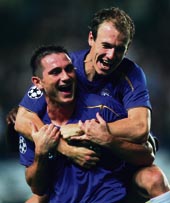 | Chelsea’s Frank Lampard (left) celebrates his goal with Arjen Robben during their Champions League match against Anderlecht at Stamford Bridge on Tuesday. (Reuters) |