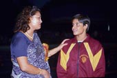 | Bula Chowdhury lauds Madhavi Giri, who won two golds, at Subhas Sarobar on Sunday. Picture by Gautam Bose |