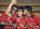 | Surkumar Singh (centre) being congratulated by teammates at the Salt Lake Stadium on Wednesday. A Telegraph picture |