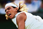 Nadal is supposed to be the next big thing. He has been dressed to kill for this tournament: white jim-jam trousers, white muscles-vest, white bandanna ? the biggest notice-me outfit worn by a male at Wimbledon since Andre Agassi, another marketing man’s dream, turned up in a three-layer white outfit that made him look like a wedding cake.