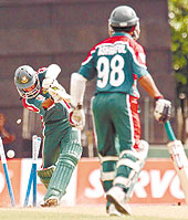 | Bangladesh skipper Habibul Bashar has his stumps shattered in the Asia Cup match against India in Colombo on Wednesday. (AP) |