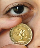 | The Euro commemorative coin on display in Athens on Wednesday to celebrate the return of Olympics in Greece. (Reuters) |