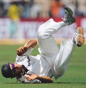 | Sourav Ganguly takes a tumble while trying to stop a shot on Day I of the third and final Test against Pakistan in Bangalore on Thursday. (Reuters) |