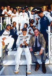 | Members of the Test series-winning squad in England pose with the Pataudi Trophy which was presented by former India captain Mansur Ali Khan at the Brit Oval in August |