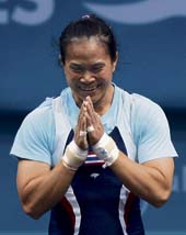 | Pawina Thongsuk of Thailand after setting a new world record in the 63kg weightlifting clean and jerk in Doha on Monday. (Reuters) |