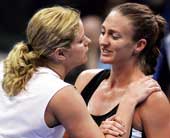 | Kim Clijsters of Belgium congratulates France’s Mary Pierce in Los Angeles on Tuesday. Pierce won 6-1, 4-6, 7-6. (Reuters) |