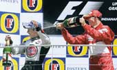 | Michael Schumacher sprays the bubbly on Takuma Sato at the Indianapolis motor speedway on Sunday. (AP) |