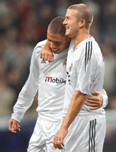 | Real Madrid?s Ronaldo is congratulated by David Beckham after the Brazilian scored his second goal against Albacete at the Santiago Bernabeu Stadium in Madrid on Sunday. Real won 6-1. (AFP) |