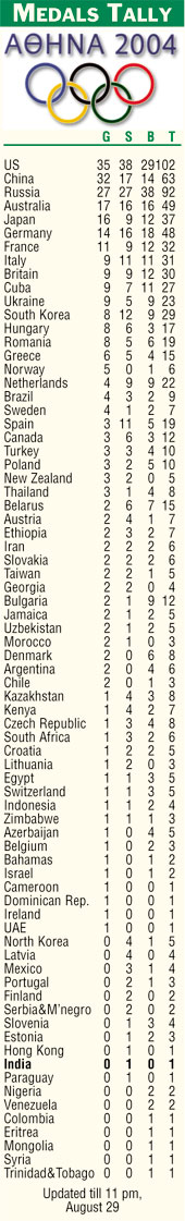 Women’s triple jump final: 1. Francoise Mbango Etone (Cam, 15.30) 2. Hrysopiyi Devetzi (Gre, 15.25) 3. Tatyana Lebedeva (Rus, 15.14).