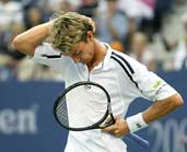 The pre-match tension translated into a virtuoso performance. Roddick saved one break point in the third game, but then dropped one more point on his serve in the first set. Ferrero, playing his fourth match in four days because of the numerous rainy days, looked tired early, slow to the ball and lost a surprising number of baseline rallies. He dropped his serve in the fourth game of the first set, losing at 30 when Roddick whipped a forehand winner down the line.