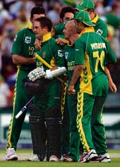 Australia surged back by dismissing Van der Wath, Telemachus and Hall in the space of 18 deliveries to reduce South Africa to 433 for nine with three balls left in the match. No. 11 Ntini nudged Lee to backward point for a single, and Boucher, who ended on 50 not out, slammed the next ball through long-on for four to win the match.